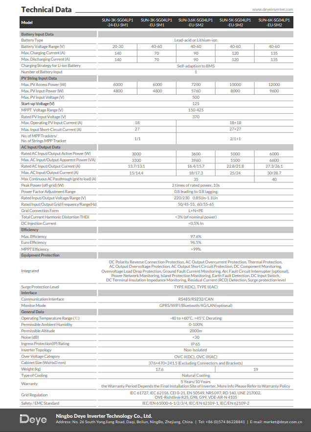 Thông số kỹ thuật biến tần Hybrid Deye (3-6)kW 1 pha bản mới