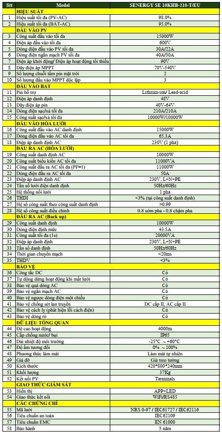 Biến tần hybrid SENERGY 10KW 1 pha là lựa chọn lý tưởng cho các hệ thống điện mặt trời gia đình cần sự ổn định, tiết kiệm và chủ động nguồn điện. Với khả năng hòa lưới kết hợp lưu trữ, hiệu suất cao, cùng kết nối thông minh và bảo hành chính hãng 5 năm – đây chính là giải pháp tối ưu cho ngôi nhà hiện đại, sẵn sàng cho tương lai năng lượng sạch.