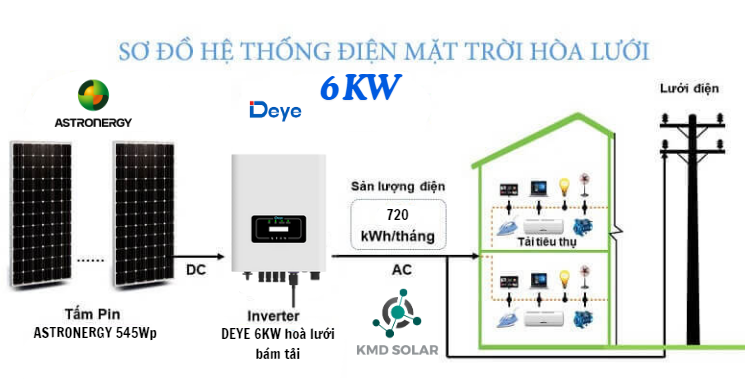 KMDSOLAR trân trọng giới thiệu đến Quý Khách hàng Combo Hệ thống điện năng lượng mặt trời hòa lưới 6kWp 01 pha. Combo của chúng tôi bao gồm Pin ASTRONERGY 545W (AE Solar, Canadian SOLAR, Longi SOLAR, JINKO SOLAR,) + INVERTER DEYE (Goodwe, Huawei, LUXPOWER) và các thiết bị phụ kiện trọn gói.