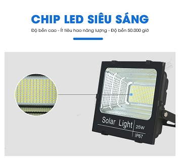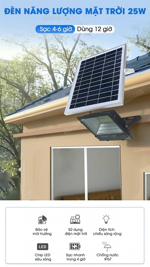 Dễ sử dụng: đèn có công suất 25W thích hợp cho các hộ gia đình có sân vườn, mái hiên hoặc khu vực nhà kho, nhà xưởng, trường học, bãi giữ xe. Quý khách hàng chỉ cần để tấm pin hấp thụ năng lượng mặt trời ở nơi cao nhất là đèn có thể sử dụng.