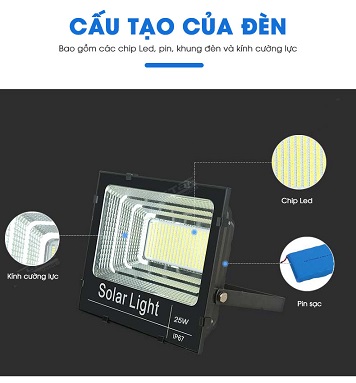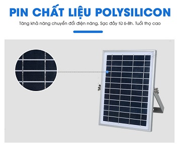 Tấm pin năng lượng mặt trời: tấm pin này có công dụng hấp thụ ánh nắng mặt trời và chuyển đối năng lượng này thành năng lượng cho đèn sử dụng. Nguồn năng lượng này được lưu trong pin sạc.