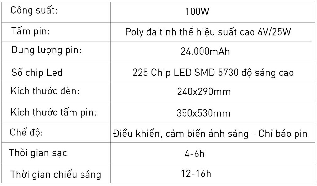 THÔNG SỐ KỸ THUẬT CỦA ĐÈN PHA NĂNG LƯỢNG MẶT TRỜI 100W