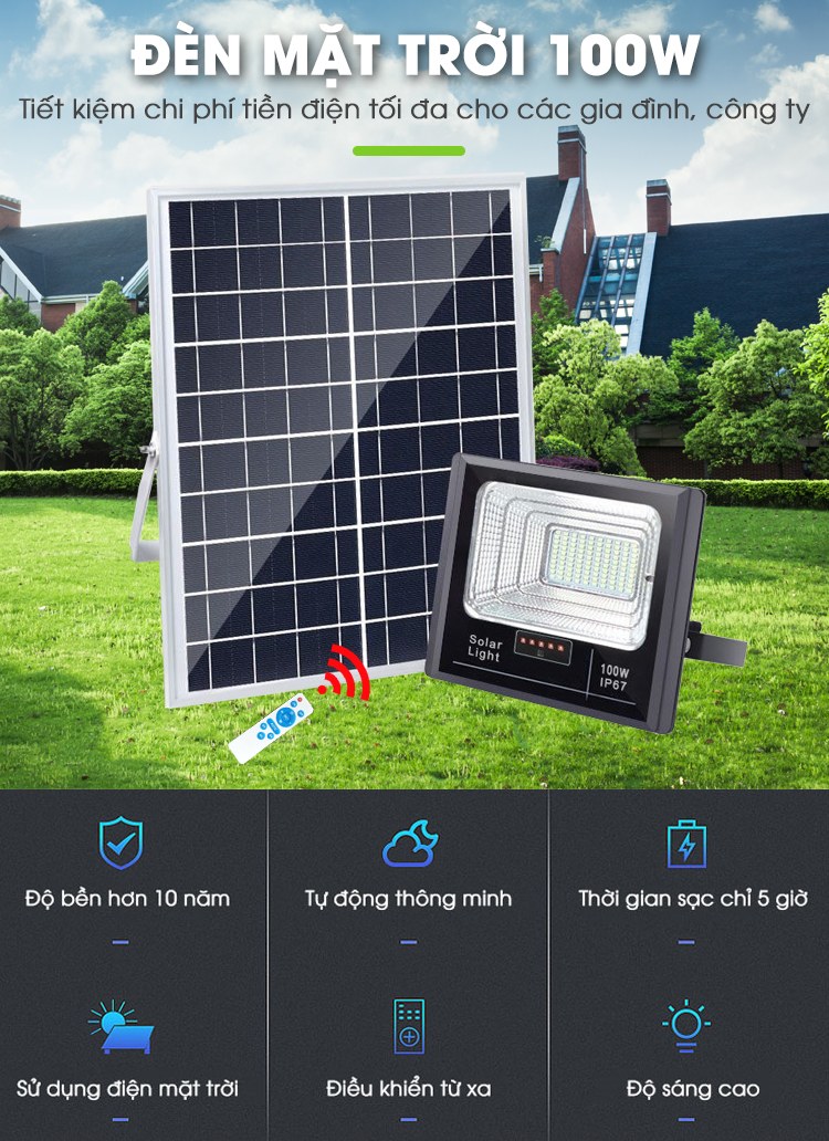 Đèn năng lượng mặt trời 100W Solar light TOPSOLAR là sản phẩm phù hợp vơi các hộ gia đình, công ty, xí nghiệp. Đèn 100W vừa giúp tiết kiệm chi phí điện mỗi tháng, vừa bảo vệ an toàn của mọi người xung quanh.