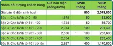 Đối với việc sử dụng điện để sinh hoạt, có 6 mức giá mua như sau:
