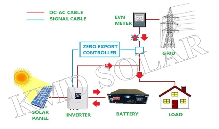 - Nguyên tắc hoạt động của hệ thống: khi khởi động Ắc quy được ưu tiên nạp đầy từ pin mặt trời. Hệ thống sẽ luôn kiểm tra tình trạng ắc quy để đảm bảo ắc quy luôn đầy điện. Khi ắc quy đầy hệ thống sẽ chuyển qua hòa lưới, giúp giảm lượng điện tiêu thụ, khi hòa lưới sử dụng tất cả các tải (tải ưu tiên và tải thông thường).
