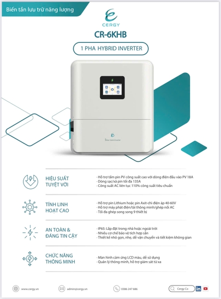 Biến tần Hybrid CERGY 6KW là thiết bị tích hợp đa năng, vừa hòa lưới, vừa lưu trữ điện, vừa đảm bảo chế độ dự phòng khi mất điện. Với thiết kế tinh gọn, hiệu suất cao và khả năng mở rộng linh hoạt, Cergy 6KW là lựa chọn lý tưởng cho các hộ gia đình, văn phòng nhỏ hoặc công trình thương mại tầm trung.